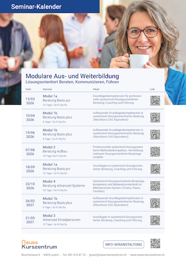 Das Team des Neuen Kurszentrums freut sich, die Aus- und Weiterbildungen in systemisch-lösungsorientierter Beratung und Coaching vom Kurszentrum Aarau übernehmen und weiterführen zu dürfen. Über 44 Jahre prägte Werner Herren das Kurszentrum Aarau, das als Pionierin des systemisch-lösungsorientierten Ansatzes eines der anerkanntesten Ausbildungsinstitute in der Schweiz war und einen hervorragenden Ruf geniessen durfte. Nachdem wir in den vergangenen 15 Jahren die Ausbildungen am Kurszentrum Aarau geleitet, mitgestaltet und weiterentwickelt haben, freuen wir uns, die Aus- und Weiterbildungen in Luzern in die Zukunft zu führen.