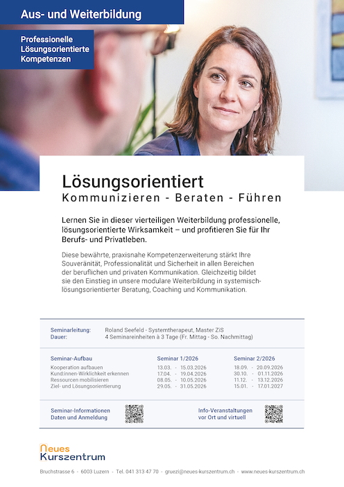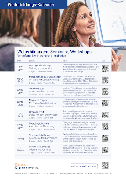 Der integrative lösungsorientierte Ansatz des Neuen Kurszentrums erweitert die systemisch-lösungsorientierte Beratung um hypnosystemische und weitere zeitgemässe Methoden, die kognitive Einsichten, emotionale Prozesse und körperliche Erfahrungen miteinander verbinden. Sie machen die lösungsorientierten Beratungsprozesse besonders effektiv und nachhaltig.